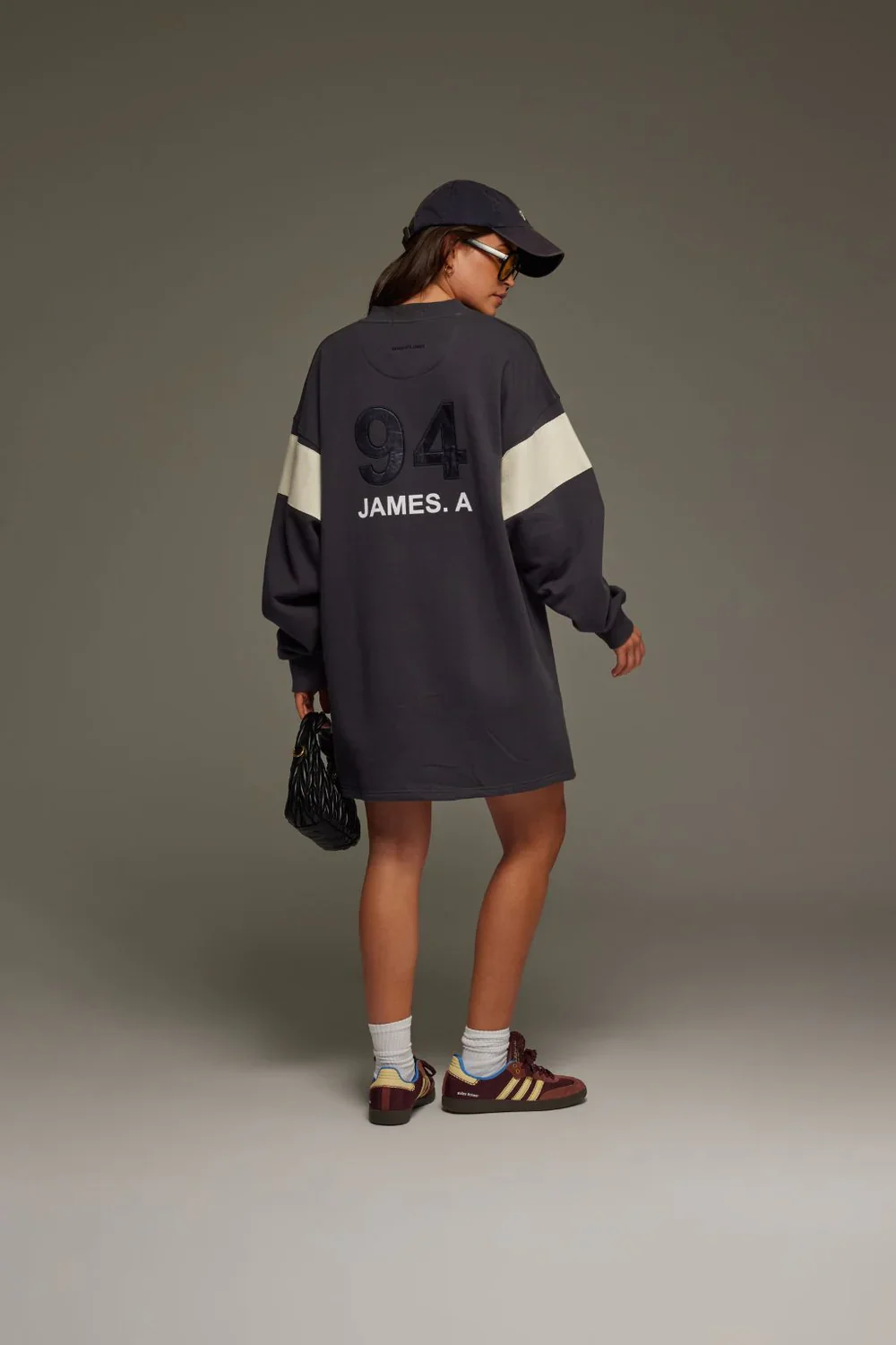 Our 94 V-Neck Sweater Dress in Noir is cut from a beautiful cotton brushed fleece, and features a contrast coconut trim on the sleeve. Elevated with a chic combination of satin and velvet applique at the back. Our 94 V-Neck Sweater Dress is effortlessly cool and pairs perfectly with your fave sneakers and sunnies.Â