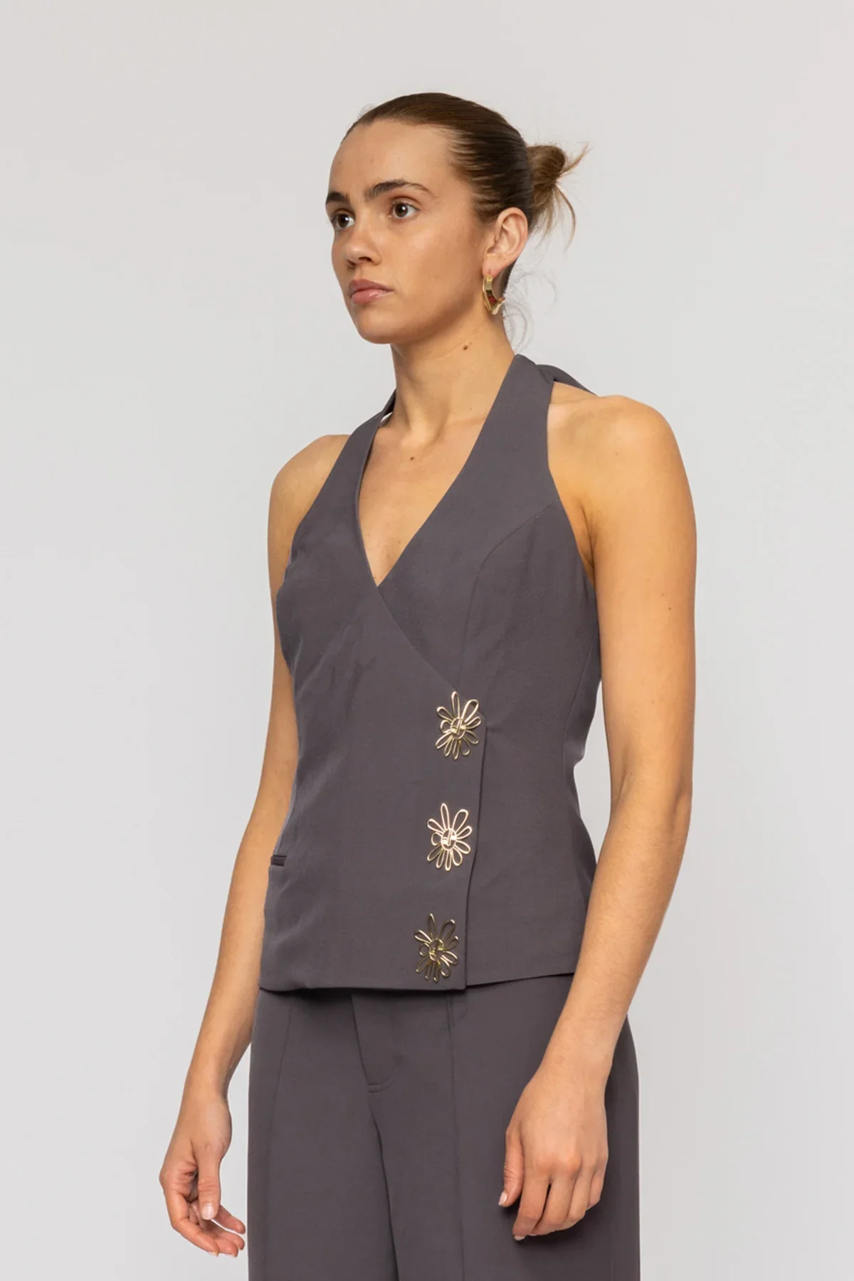 The Inka Vest Top seamlessly blends professional tailoring with a touch of bold, modern edge. Featuring a feminine halter neck tie and an asymmetric front closure, it’s elevated by custom TWG hardware. A zipper at the back has been added for ease of wear, making it effortless to slip on. Perfect for a polished, coordinated look with its matching pant or relaxed yet refined when paired with jeans.
