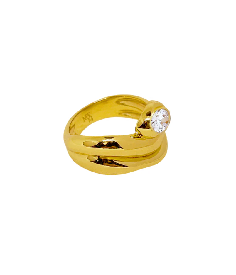 The MILA Ring in Gold is both interesting and sophisticated with a beautiful fluid shape adorned with a sparkling White CZ gemstone that lights up your ring collection. She boasts a double band wrap design finished in our signature high polish plating. There is something so unique about the Mila, she pairs perfectly with a mix metal stack or an absolutely standout all on her own. You won't be able to resist reaching for it every time!