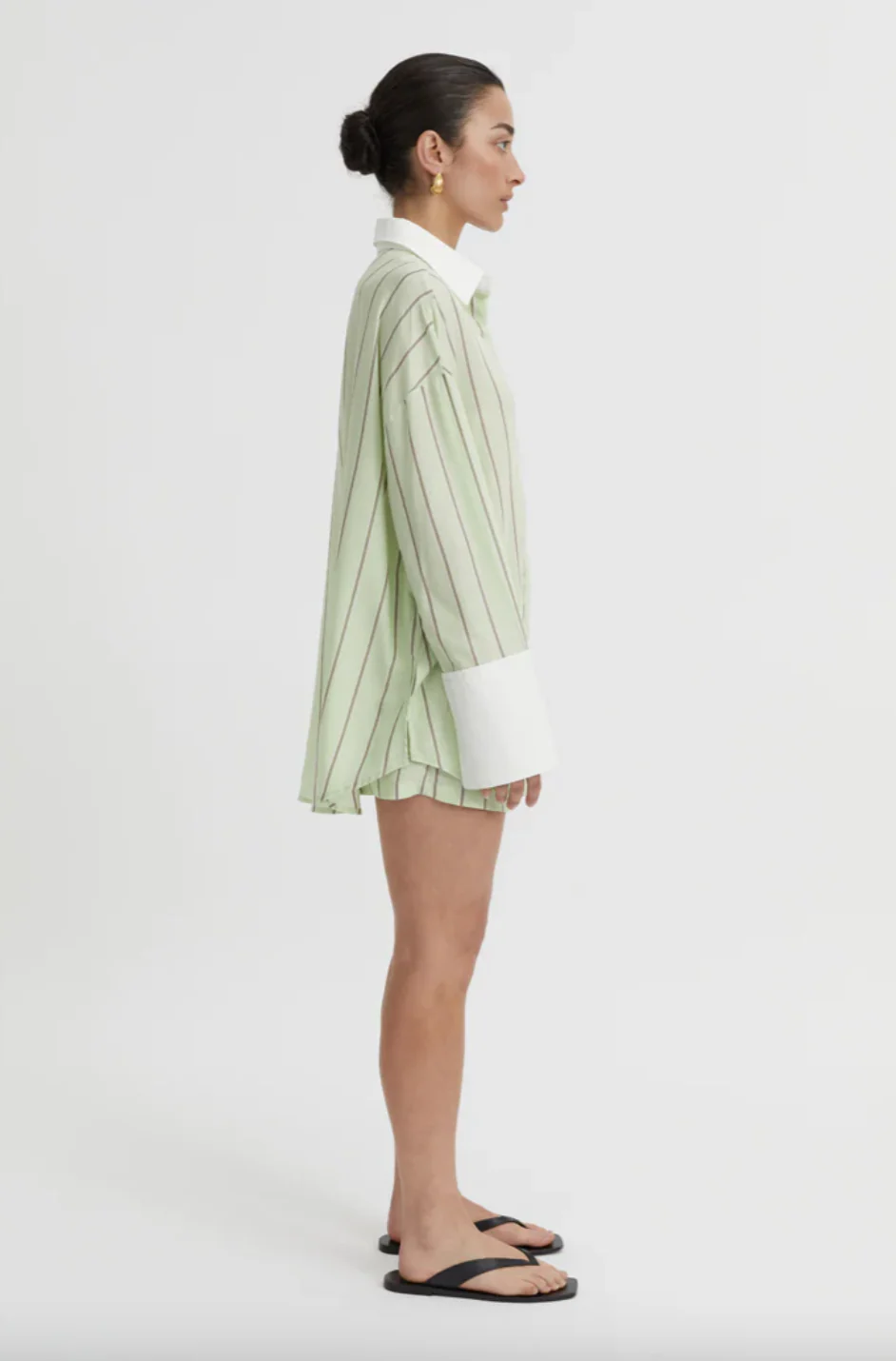 Refresh your wardrobe with the Opal Shirt in Pistachio — a breezy, oversized button-down that pairs crisp white with soft green stripes for an effortlessly refined look. Featuring structured cuffs, a sharp collar, and a relaxed drop-shoulder fit, it’s made from lightweight cotton for breathable comfort.