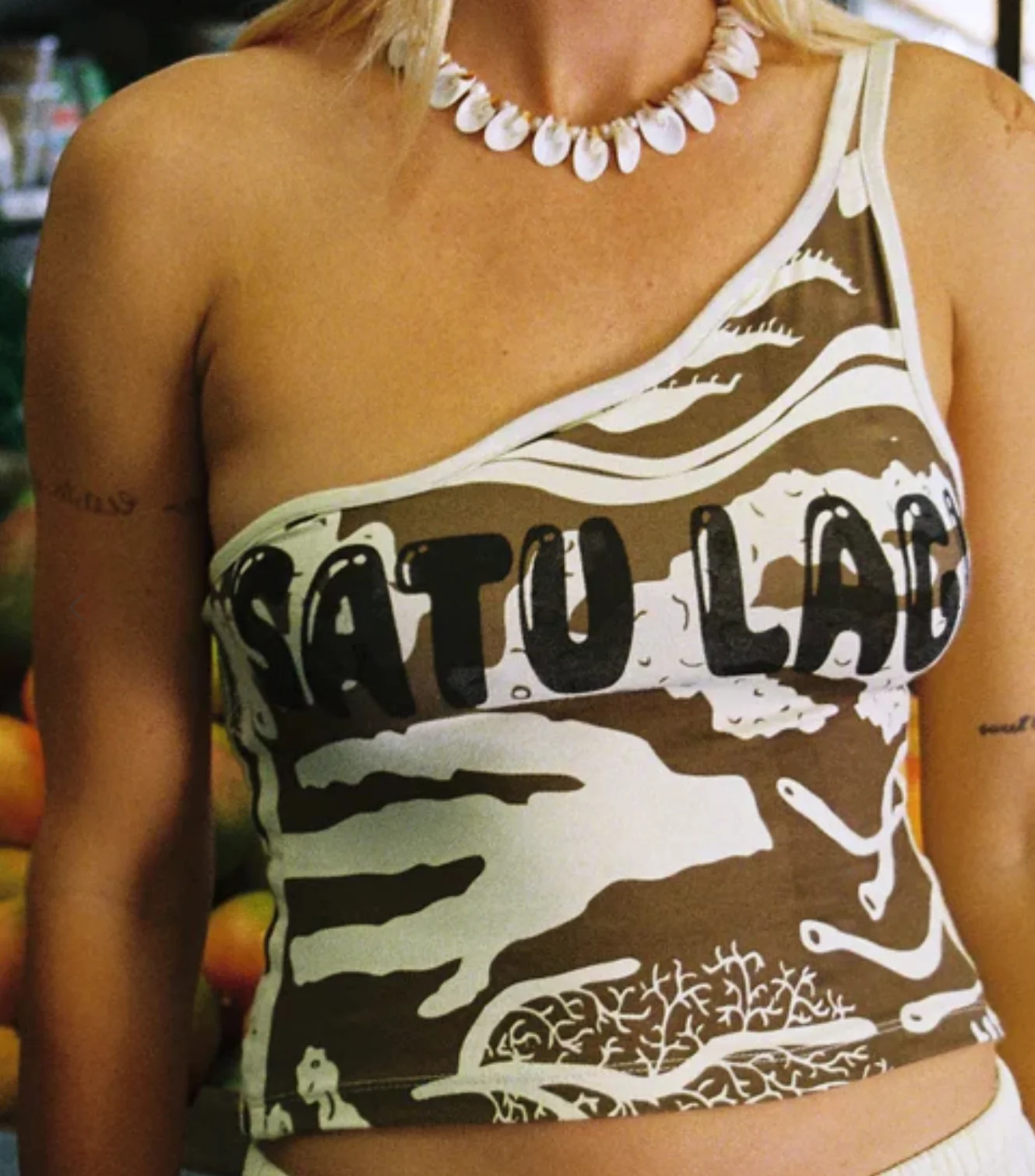 A fitted one shoulder top in luxurious cotton bamboo stretch fabric, featuring a scallop wavey neckline and two strap detail, chest print and Lotties signature hand drawn coral print