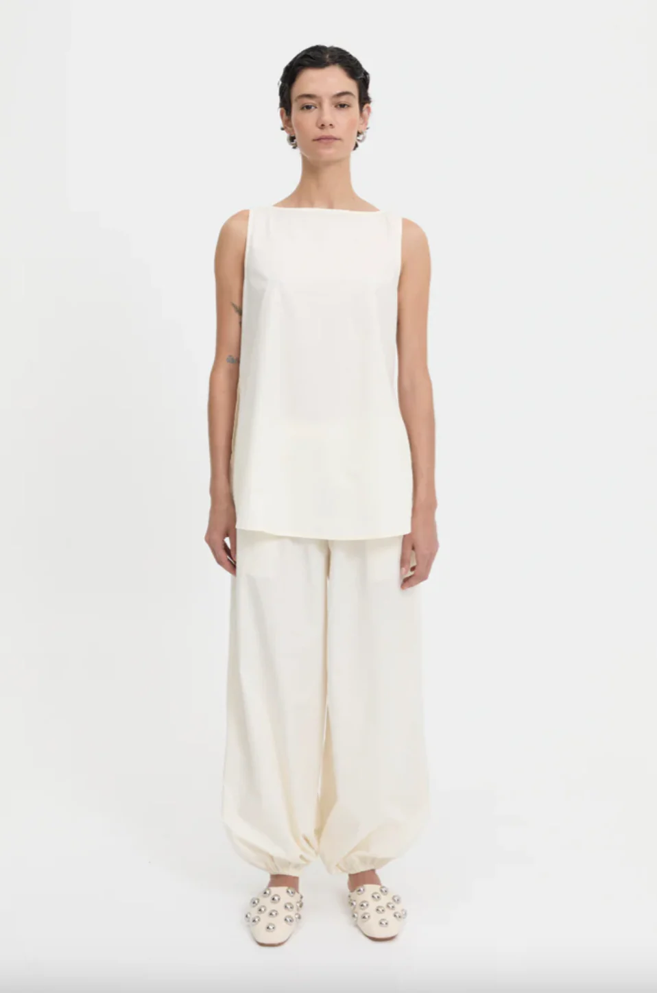 The Yan Pants offer an effortless balance of comfort and structure in a soft ivory hue. Designed with a relaxed, wide-leg silhouette, they feature an elasticated waistband and subtle volume through the leg, finishing with gentle gathers at the hem. Worn alone or styled with the matching Yan Top, they create a refined, modern set grounded in ease.