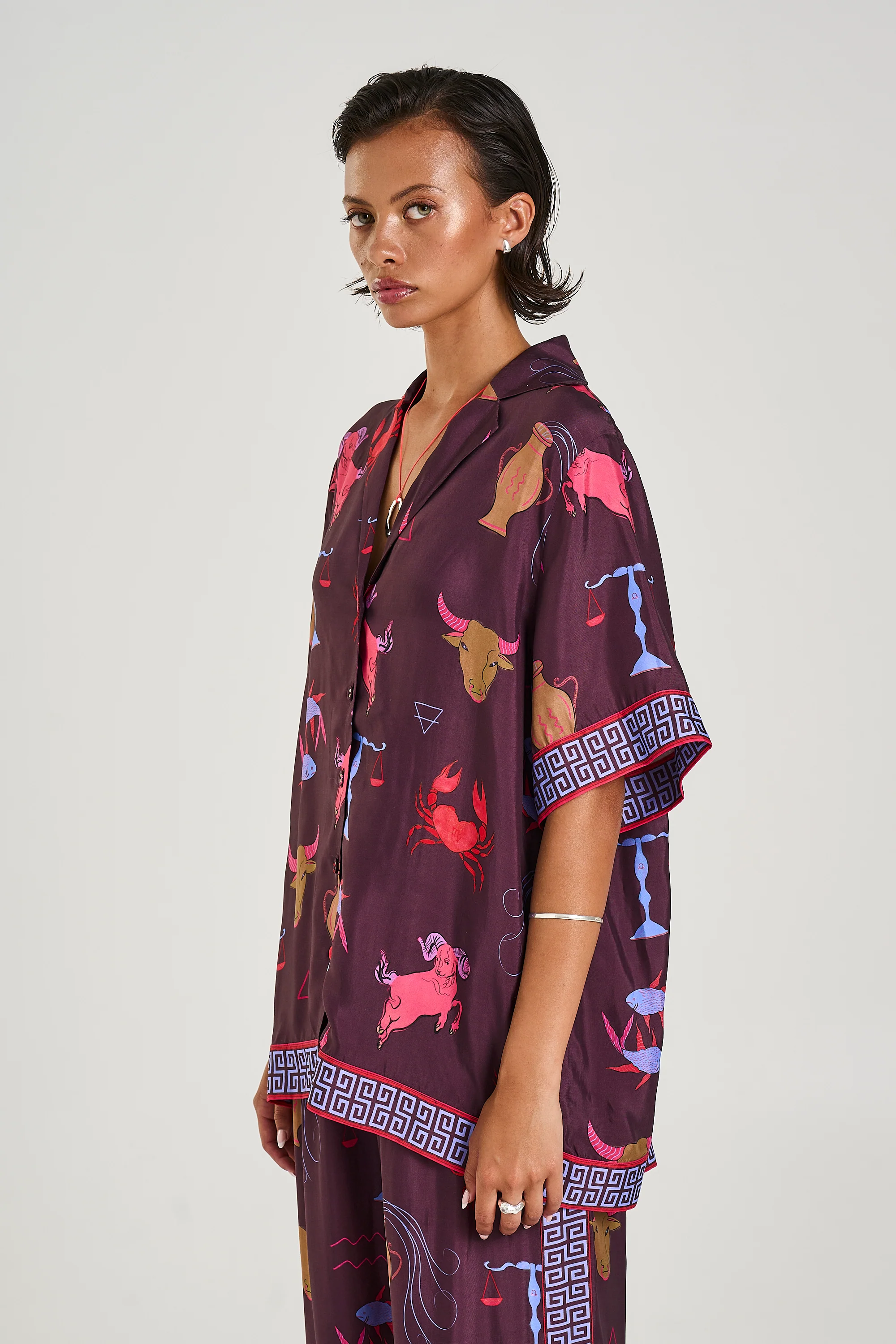The Button Up Shirt made from silky cupro features the Zodiac print and structured SS trim, designed for a sleek yet relaxed fit.